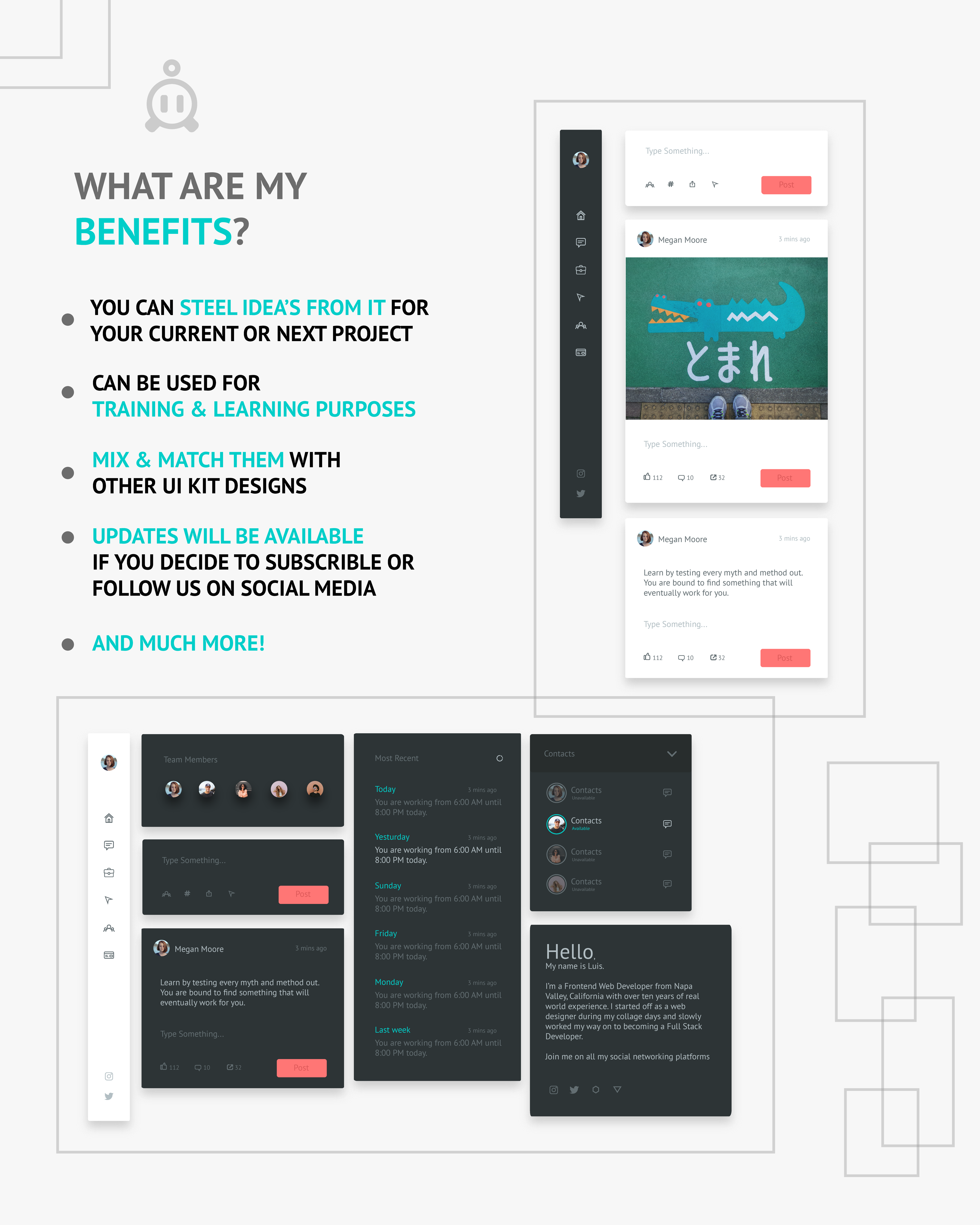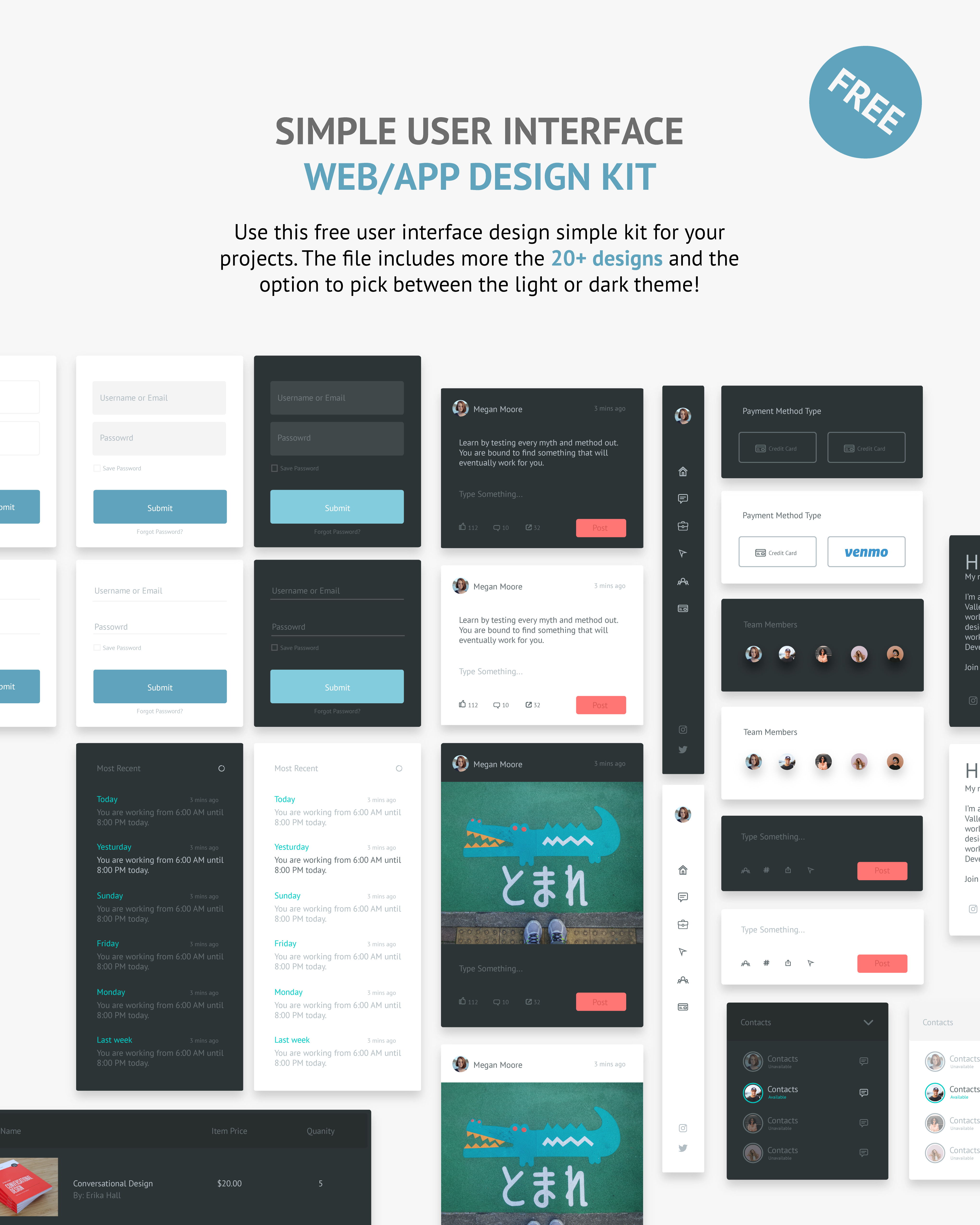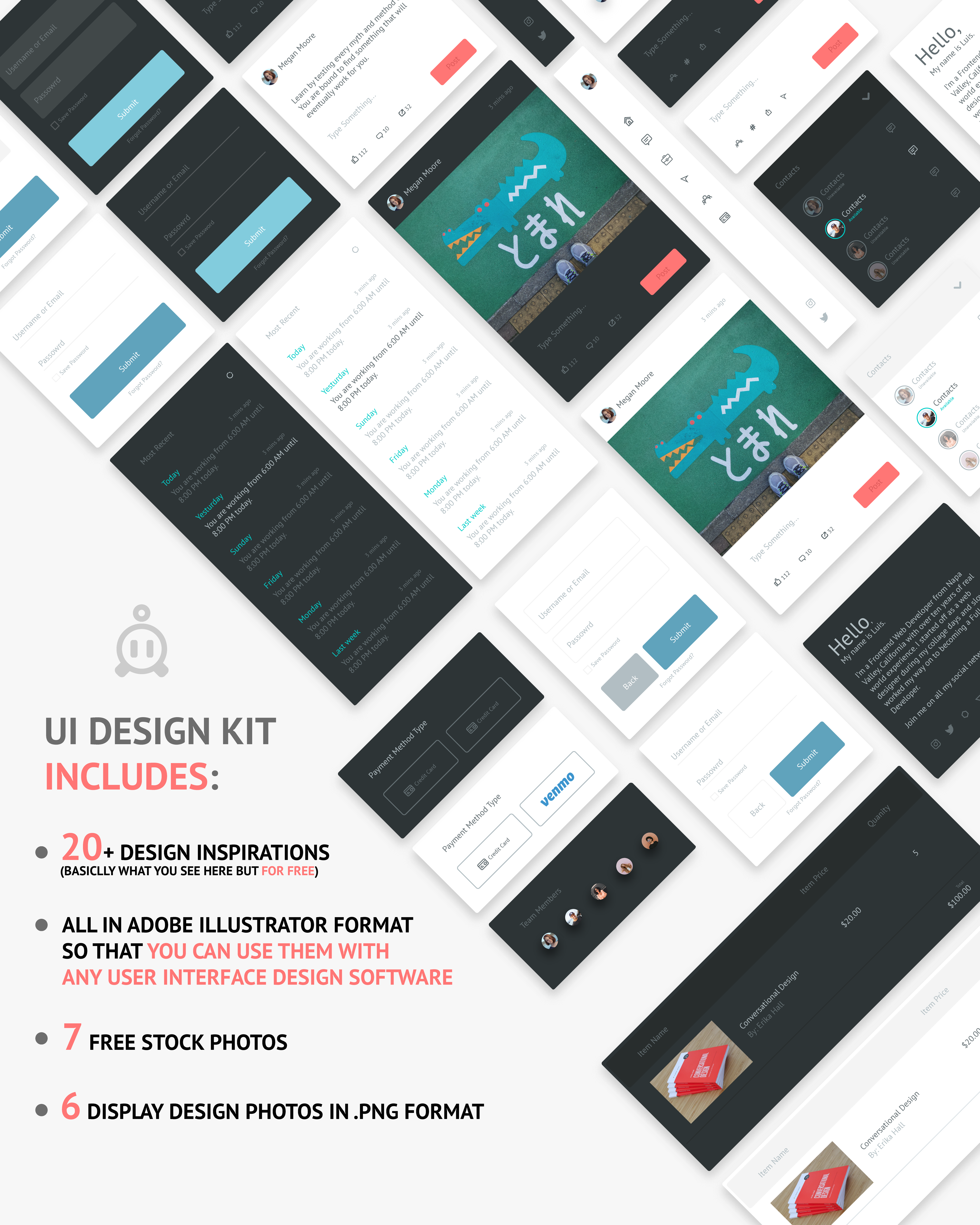 This is a user interface website or app inspiration design consisting of 20+ designs for any designer or developer to implement within their projects.What will it include: 20+ User Interface Design (.AI format), Light & Dark theme designs, Stock Images, Image Design Samples